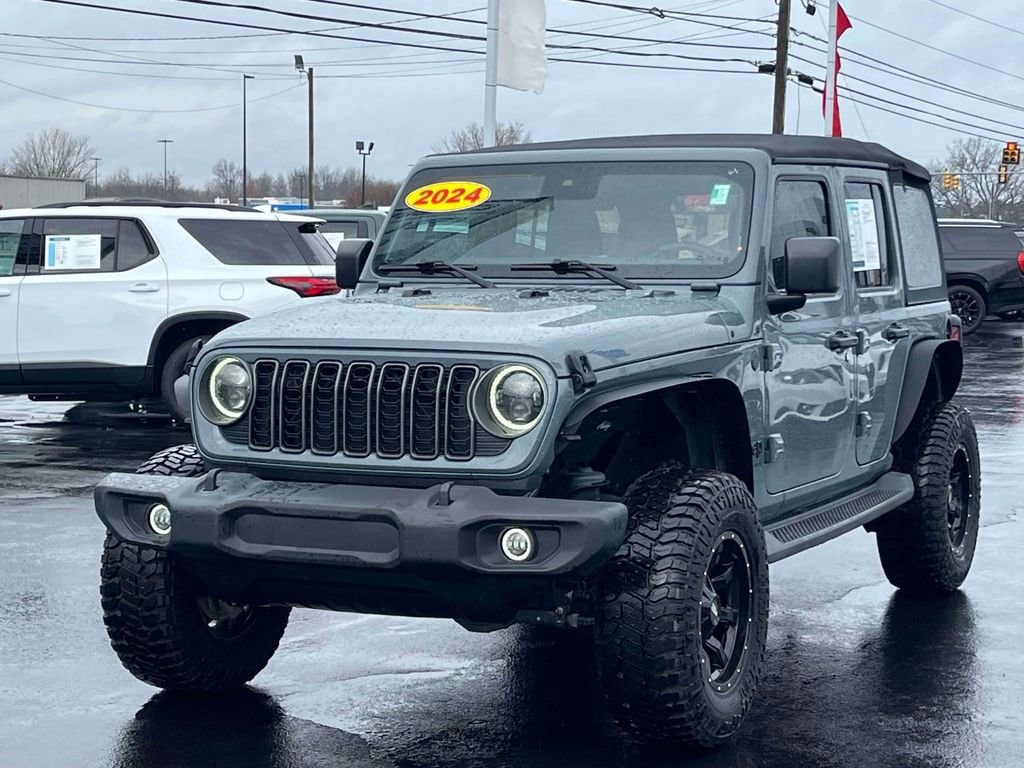It offers Android Auto for seamless smartphone integration. Bluetooth technology is built into the vehicle, keeping your hands on the steering wheel and your focus on the road. An off-road package is installed on the vehicle so you are ready for your four-wheeling best. This vehicle is a certified CARFAX 1-owner. Protect this model from unwanted accidents with a cutting edge backup camera system. Keep your hands warm all winter with a heated steering wheel in this mid-size suv . This mid-size suv has auto-adjust speed for safe following. This model's Forward Collision Warning feature alerts drivers to potential front-end collisions. Our dealership has already run the CARFAX report and it is clean. A clean CARFAX is a great asset for resale value in the future. Apple CarPlay: Seamless smartphone integration for this mid-size suv - stay connected and entertained on the go! Start this 2024 Jeep Wrangler from inside with remote start.This vehicle has four wheel drive capabilities. Anti-lock brakes will help you stop in an emergency. The Jeep Wrangler has auto-adjust speed for safe following. The vehicle is accented with premium quality alloy wheels. The vehicle offers Android Auto for seamless smartphone integration. This model offers Apple CarPlay for seamless connectivity. This vehicle keeps you comfortable with Auto Climate. This Jeep Wrangler has an automatic transmission. Protect this model from unwanted accidents with a cutting edge backup camera system. Good News! This certified CARFAX 1-owner vehicle has only had one owner before you. Our dealership has already run the CARFAX report and it is clean. A clean CARFAX is a great asset for resale value in the future. This model has gone through a stringent manufacturer pre-owned certification process, including a meticulous mechanical and reconditioning processes. Take the stress out of car buying with this certified pre-owned. Maintaining a stable interior temperature in the Jeep Wrangler is easy with the climate control system. Easily set your speed in the vehicle with a state of the art cruise control system. Increase or decrease velocity with the touch of a button. The Electronic Stability Control will keep you on your intended path. The vehicle has a V6, 3.6L high output engine. Front and rear side curtain airbags are included on this 2024 Jeep Wrangler . The fog lights cut through the weather so you can see what's ahead. It's Forward Collision Warning feature alerts drivers to potential front-end collisions. This mid-size suv has front air bags that will protect you and your passenger in the event of an accident. Stay safe with additional front side curtain airbags. This Jeep Wrangler is equipped with a gasoline engine. It projects refinement with a racy metallic gray exterior. This model features a hands-free Bluetooth phone system. The vehicle has heated side mirrors to keep your vision clear in winter weather. Keep your hands warm all winter with a heated steering wheel in this 2024 Jeep Wrangler . Quickly unlock this model with keyless entry. This mid-sized SUV is perfect for your next adventure. An off-road package is equipped on this Jeep Wrangler. Start this Jeep Wrangler from inside with remote start. It has satellite radio capabilities. It has an adjustable telescoping wheel that allows you to achieve a perfect fit for your driving comfort. This model comes standard with a state of the art traction control system. This unit is equipped with the latest generation of XM/Sirius Radio.This unit has four wheel drive capabilities. Anti-lock brakes are standard on this vehicle. This mid-size suv has auto-adjust speed for safe following. This vehicle is accented with premium quality alloy wheels. This Jeep Wrangler comes equipped with Android Auto for seamless smartphone integration on the road. The vehicle offers Apple CarPlay for seamless connectivity. This vehicle keeps you comfortable with Auto Climate. This model has an automatic transmission. See what's behind you with the back up camera on this Jeep Wrangler. Good News! This certified CARFAX 1-owner vehicle has only had one owner before you. This model has a clean CARFAX vehicle history report. This unit has gone through a stringent manufacturer pre-owned certification process, including a meticulous mechanical and reconditioning processes. Take the stress out of car buying with this certified pre-owned. Set the temperature exactly where you are most comfortable in this unit. The fan speed and temperature will automatically adjust to maintain your preferred zone climate. Easily set your speed in this Jeep Wrangler with a state of the art cruise control system. Increase or decrease velocity with the touch of a button. The Electronic Stability Control will keep you on your intended path. This model has a V6, 3.6L high output engine. Front and rear side curtain airbags are included on the Jeep Wrangler. The fog lights cut through the weather so you can see what's ahead. It's Forward Collision Warning feature alerts drivers to potential front-end collisions. This 2024 Jeep Wrangler is equipped with front air bags. The Jeep Wrangler is equipped with front side curtain airbags. This Jeep Wrangler is equipped with a gasoline engine. This vehicle projects refinement with a racy metallic gray exterior. This model features a hands-free Bluetooth phone system. This 2024 Jeep Wrangler has heated side mirrors to keep your vision clear in winter weather. Keep your hands warm all winter with a heated steering wheel in this Jeep Wrangler . With the keyless entry system on this mid-size suv you can pop the trunk without dropping your bags from the store. This mid-sized SUV is perfect for your next adventure. An off-road package is equipped on it. Never get into a cold vehicle again with the remote start feature on this 2024 Jeep Wrangler . This 2024 Jeep Wrangler has satellite radio capabilities. This mid-size suv has an adjustable telescoping wheel that allows you to achieve a perfect fit f